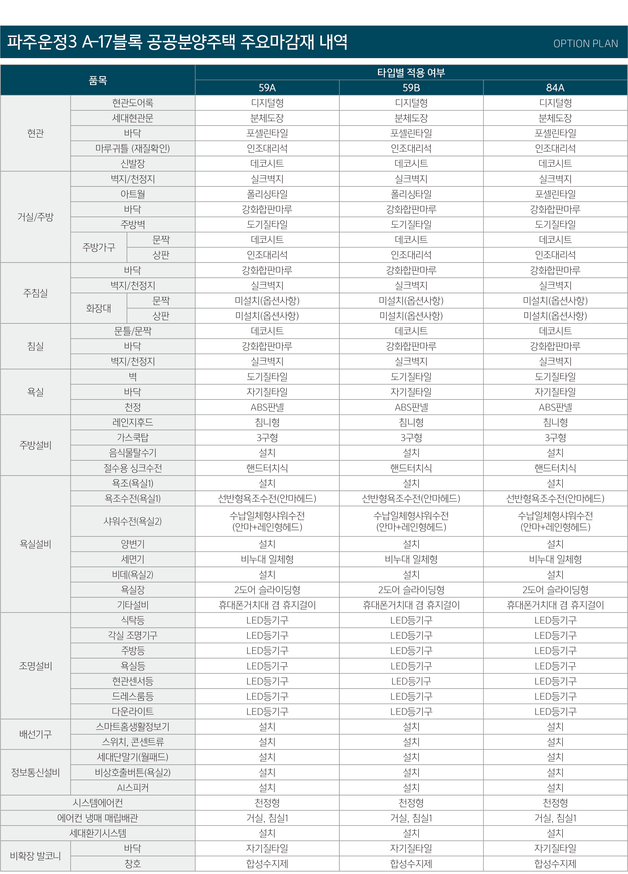 ※ 적용된 마감재는 성능향상을 위하여 설치물의 변경 또는 형태의 변경이 있을 수 있고, 유사색상 및 무늬를 지닌 동등이상의 성능을 가진 제품으로 대체시공되거나 생산업체의 부도 및 관계법령 등에 저촉될 경우 동등 이상의 제품으로 변경될 수 있습니다.